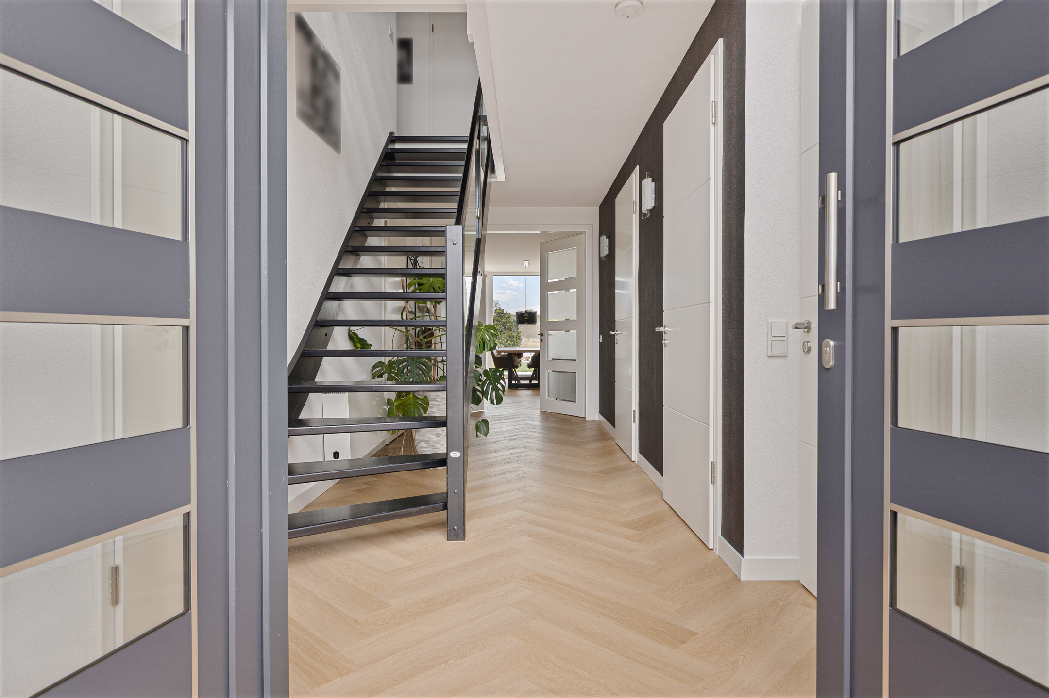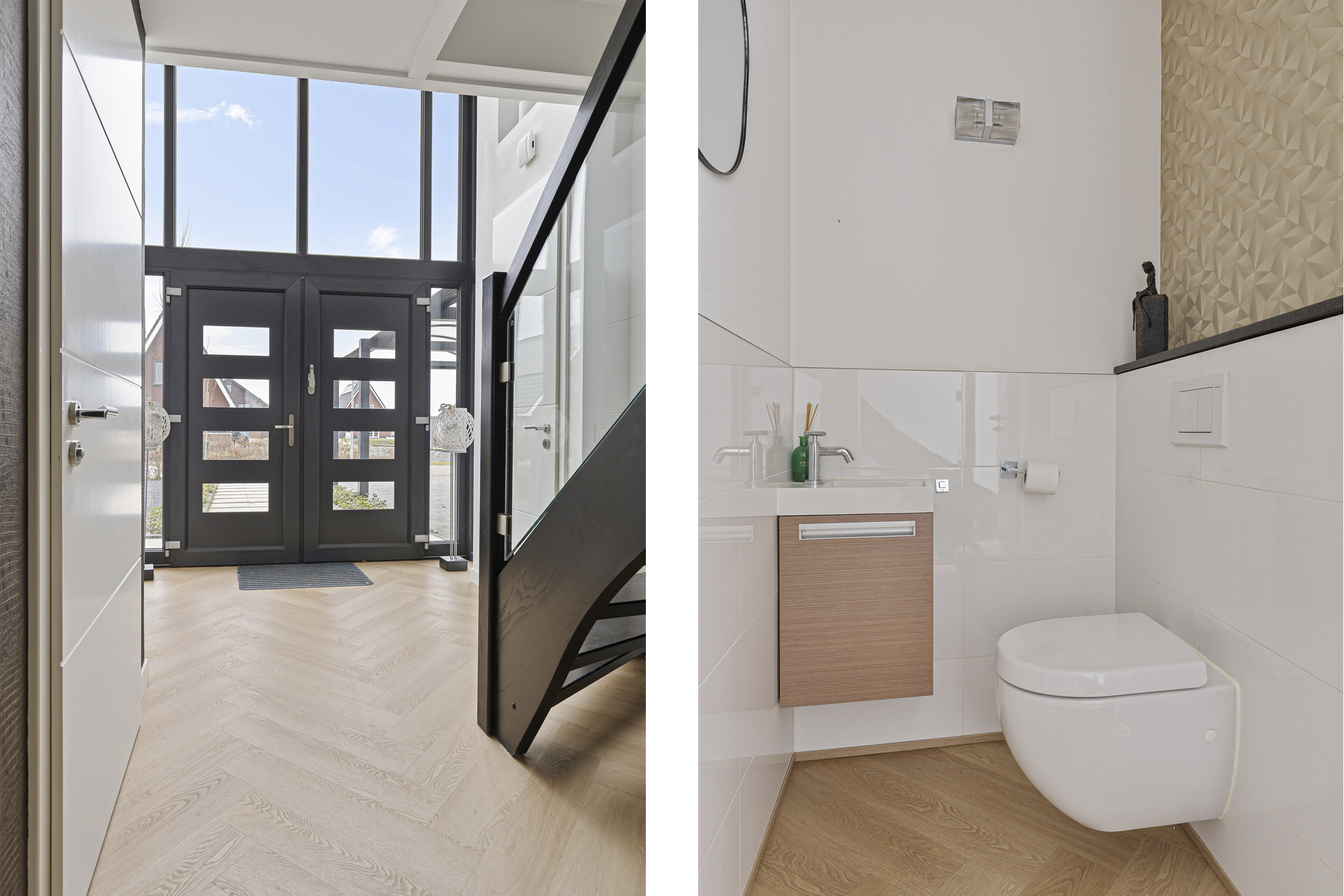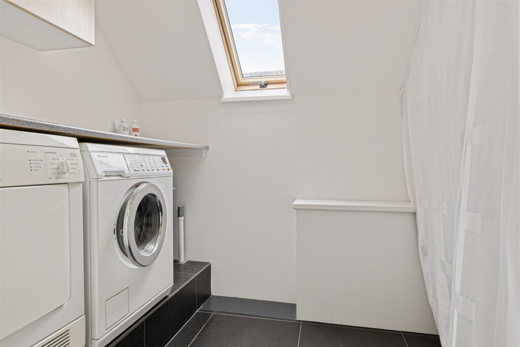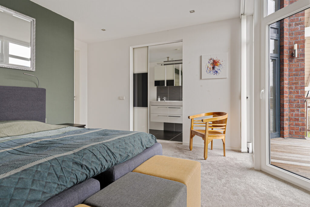 Wat ook direct in het oog springt op de begane grond is de entree annex ontvangsthal. Niet alleen vanwege de omvang, vooral de glazen pui voorzien van dubbele deuren. Dubbele deuren die aan de andere kant van de ruimte ook naar de woonkamer leiden. Meer praktisch? Het modern uitgevoerde toilet en de afsluitbare garderobe in de hal. Of juist de slaapkamer met aangrenzend de beoogde badkamer voor levensloopbestendig gebruik. Hier zijn de aansluitingen voor uw badkamer al voorbereid.