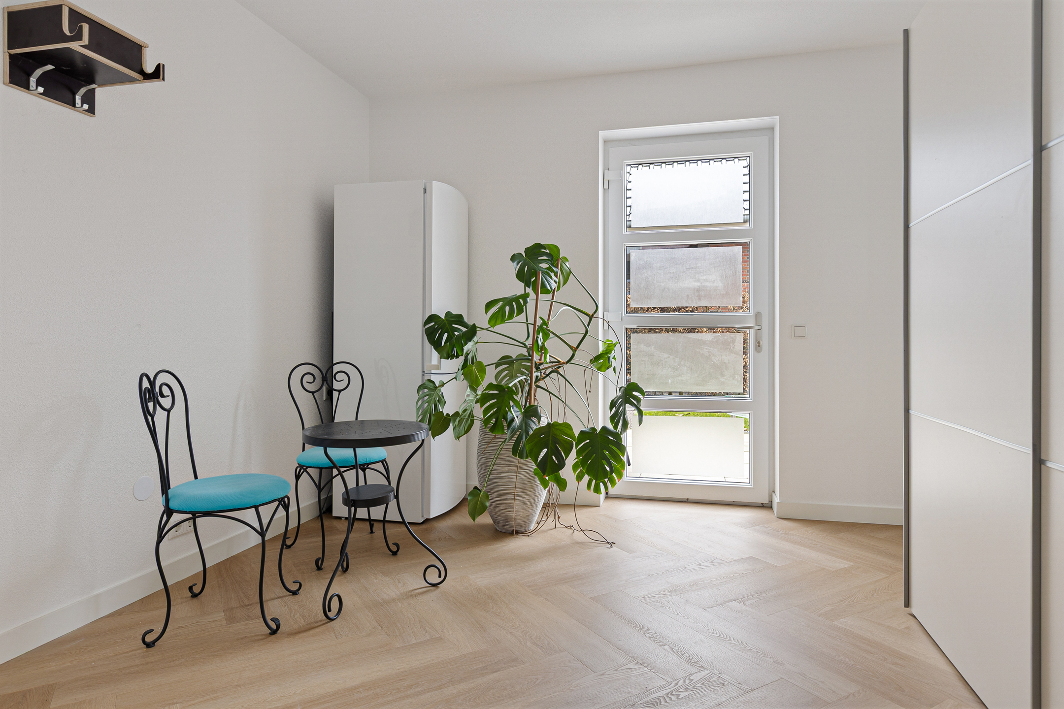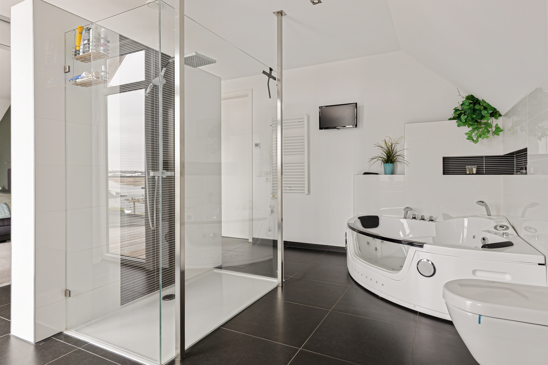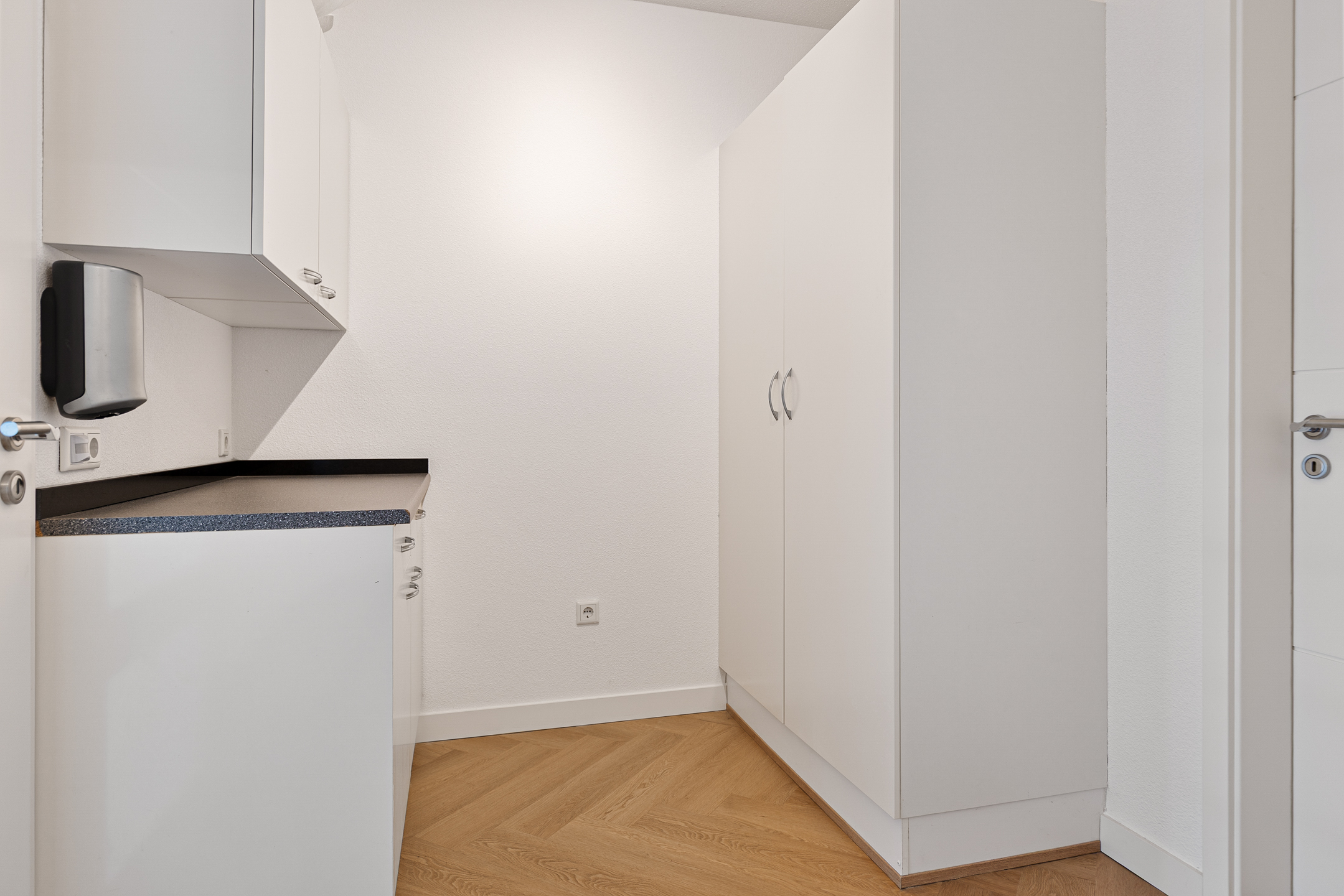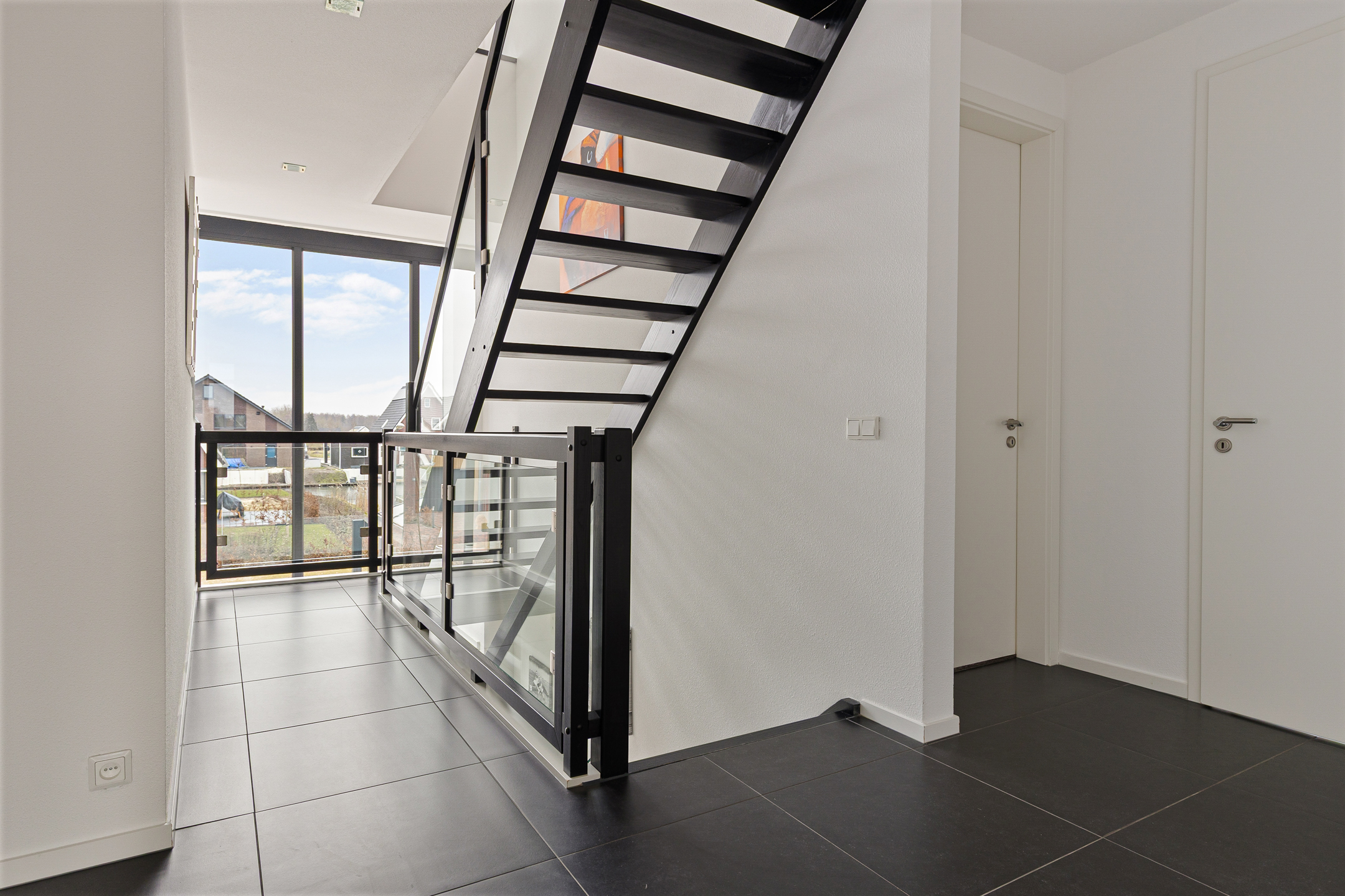 Wat ook direct in het oog springt op de begane grond is de entree annex ontvangsthal. Niet alleen vanwege de omvang, vooral de glazen pui voorzien van dubbele deuren. Dubbele deuren die aan de andere kant van de ruimte ook naar de woonkamer leiden. Meer praktisch? Het modern uitgevoerde toilet en de afsluitbare garderobe in de hal. Of juist de slaapkamer met aangrenzend de beoogde badkamer voor levensloopbestendig gebruik. Hier zijn de aansluitingen voor uw badkamer al voorbereid.
