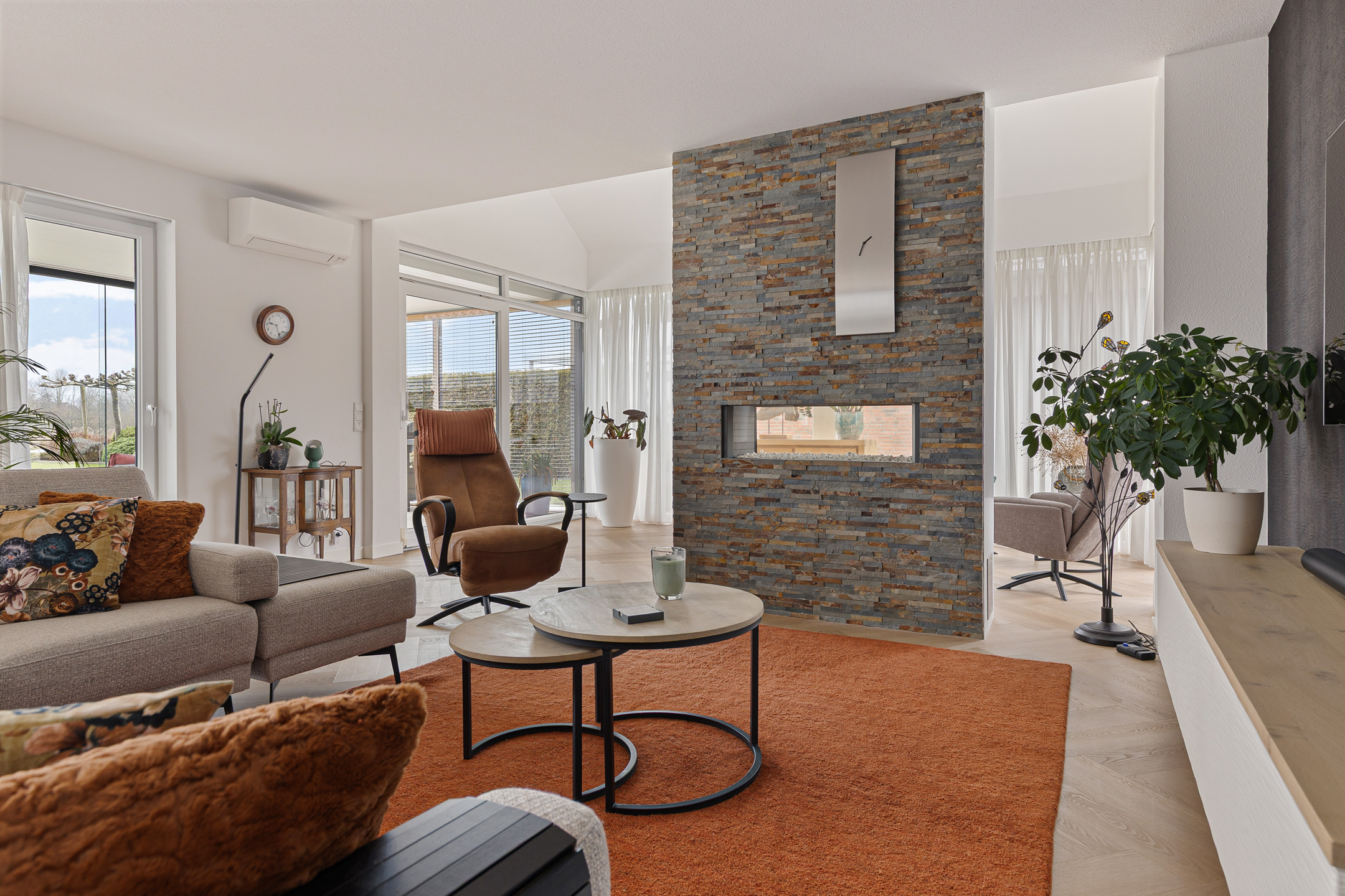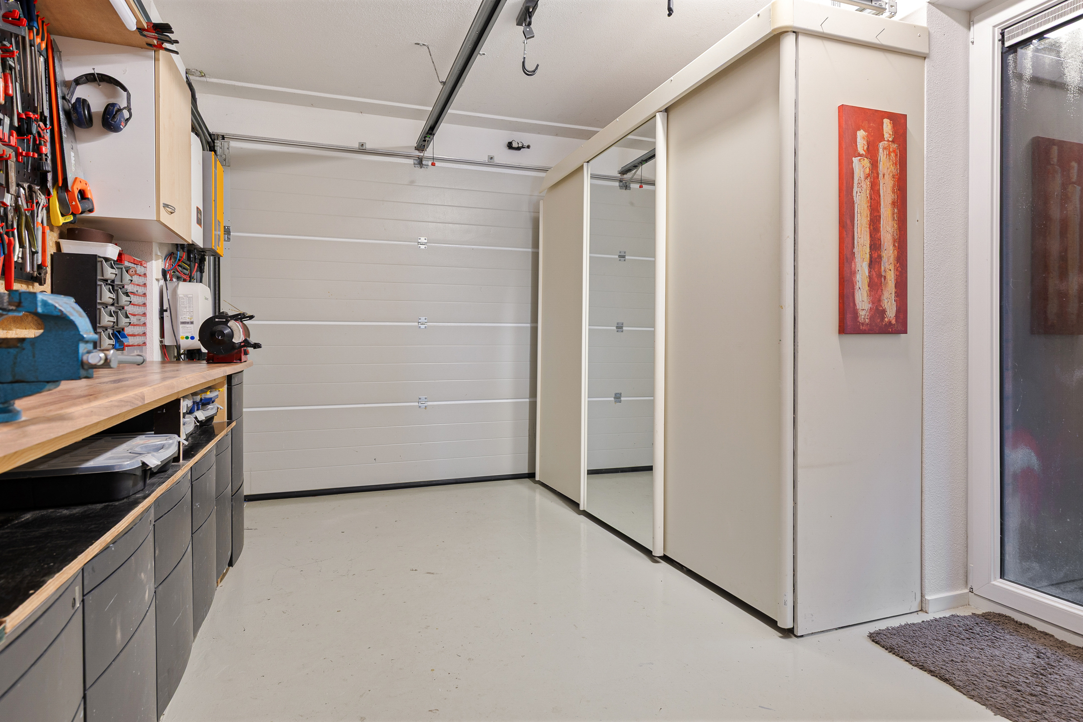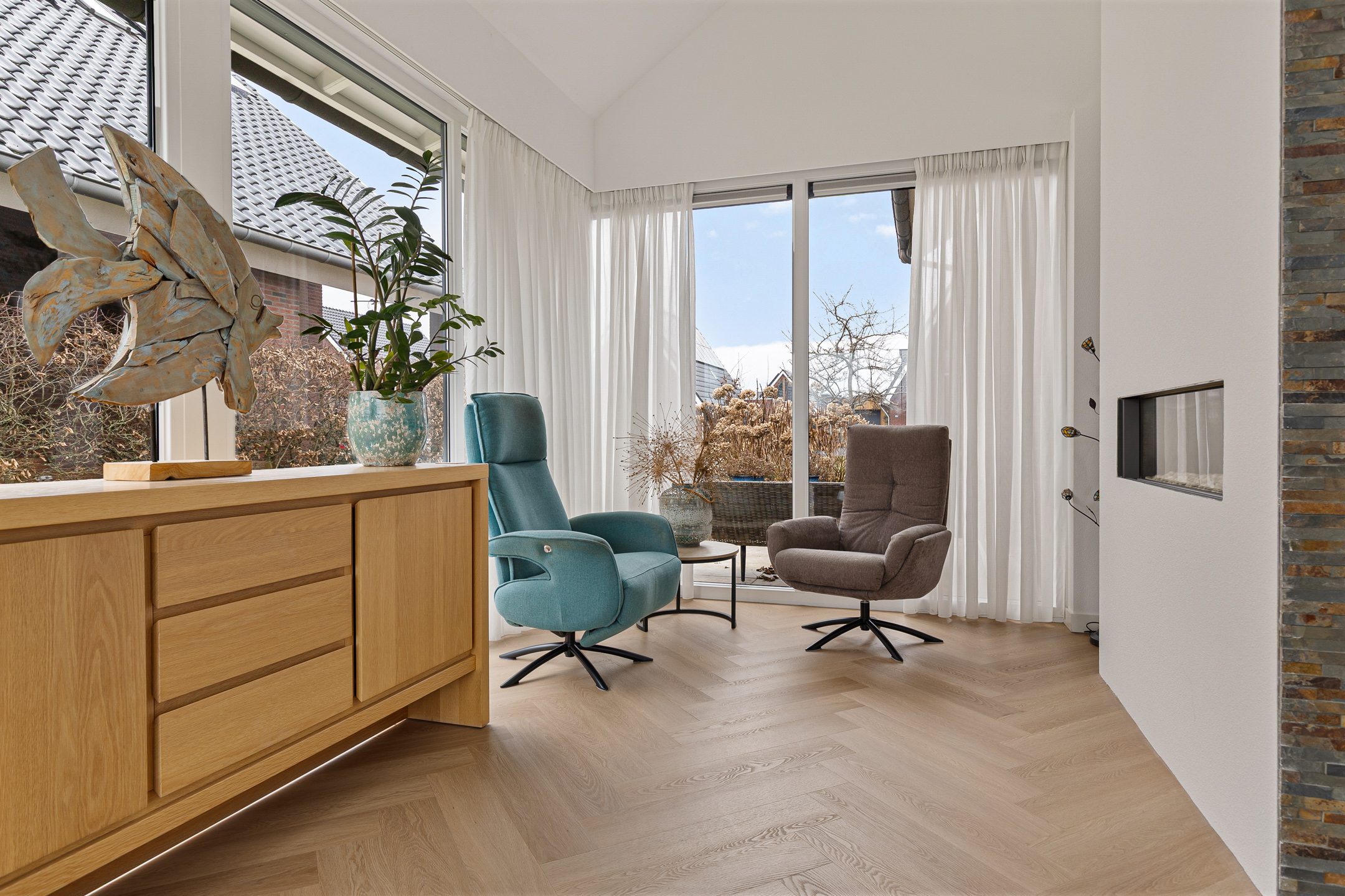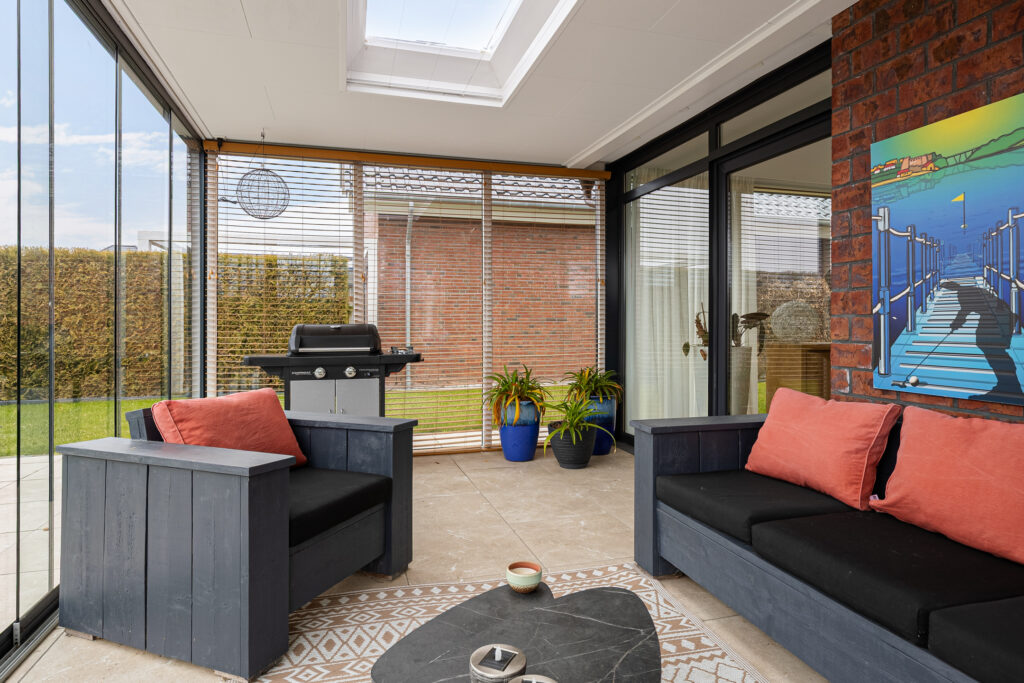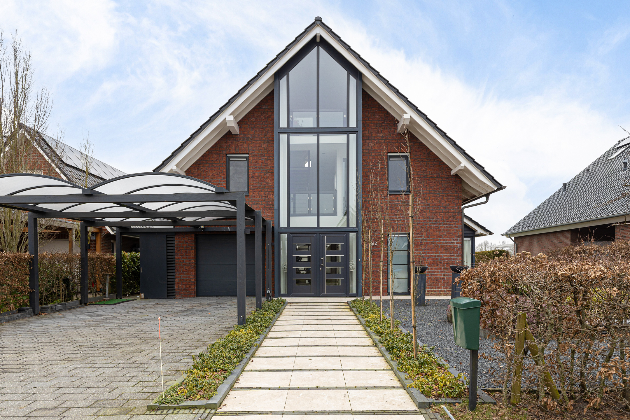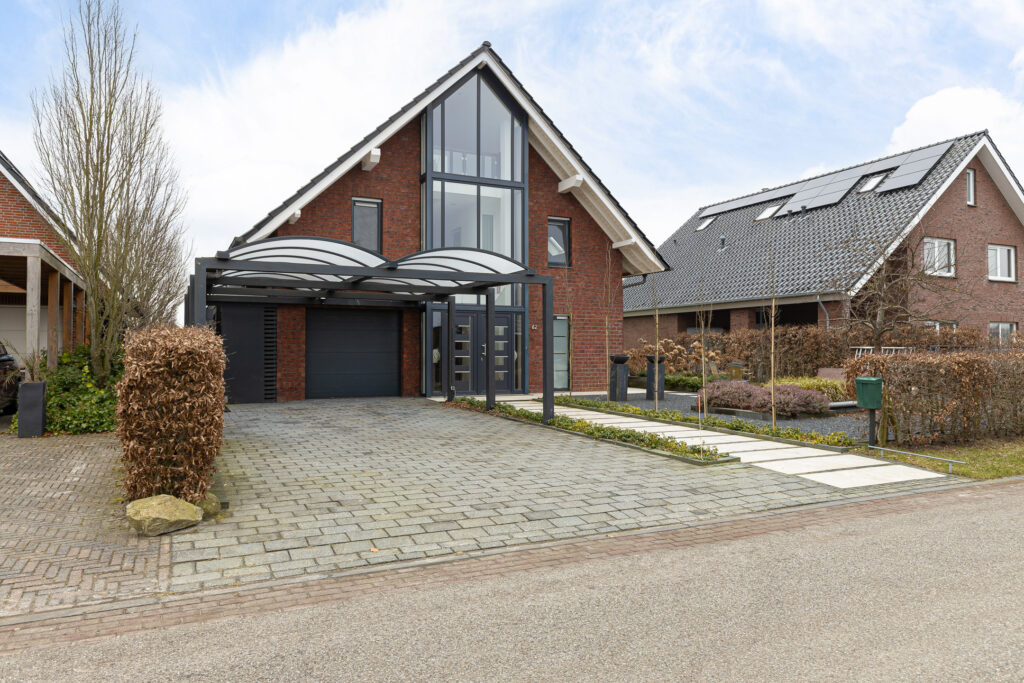 Aan de straatzijde valt naast de moderne architectuur en omvang van de woning direct een aantal zaken op. Zo beschikt het in de eerste plaats over een royale, dubbele oprit met dito carport. Twee auto’s ‘droog’ parkeren op eigen terrein dus! Aan de andere zijde van het perceel is een tweede, afsluitbare oprit annex parkeerplaats aangelegd. Ideaal voor de tijdelijke stalling van uw camper of caravan… En dan ‘vergeten’ we de inpandige garage zelfs nog, in het verlengde van de dubbele carport met extra aangebouwde berging.