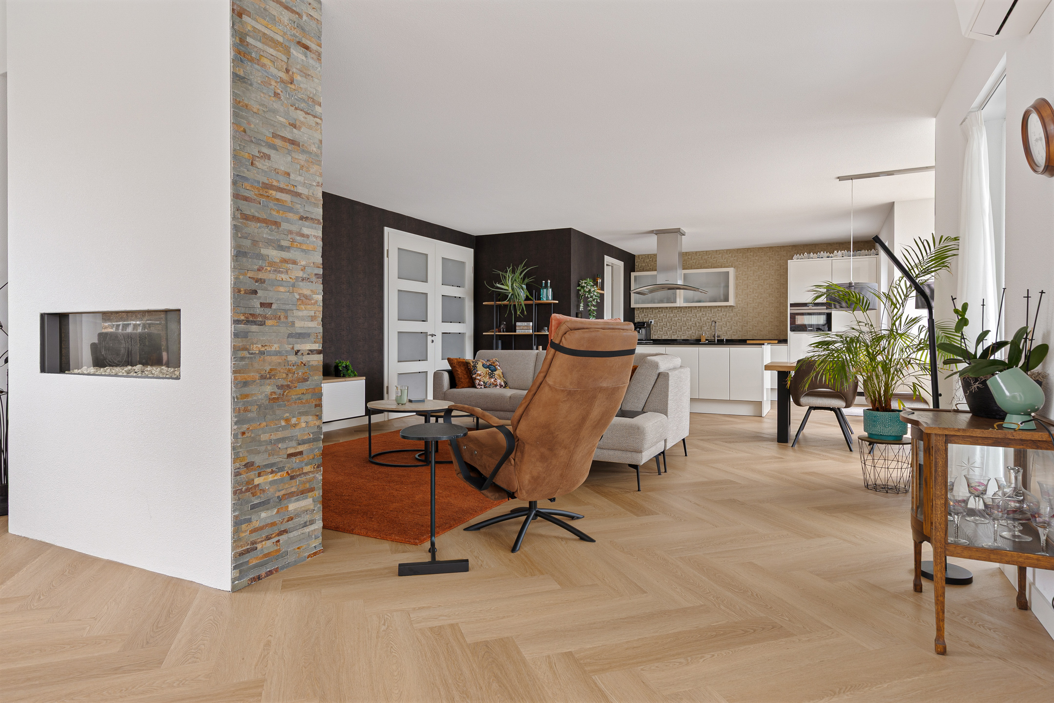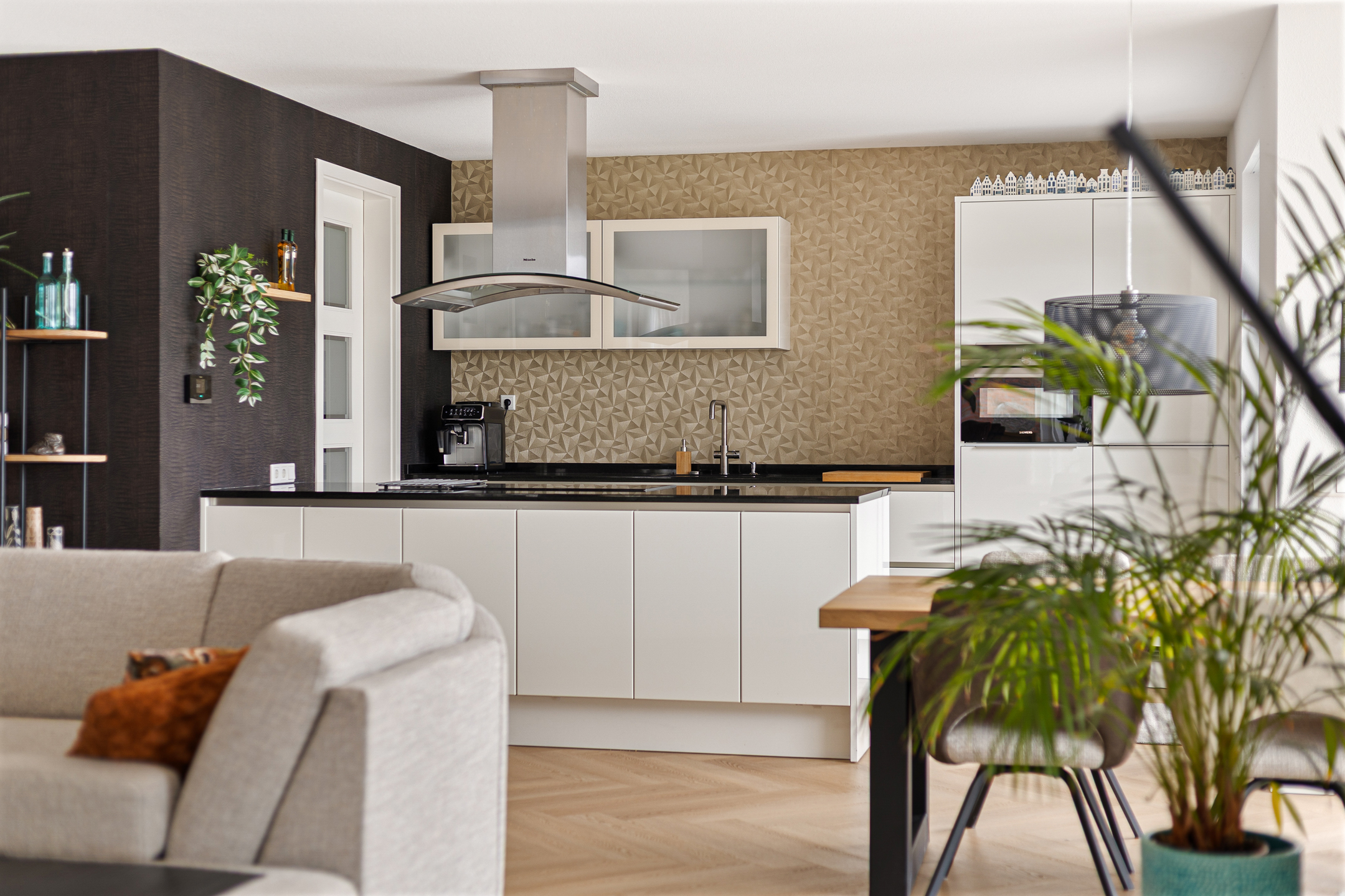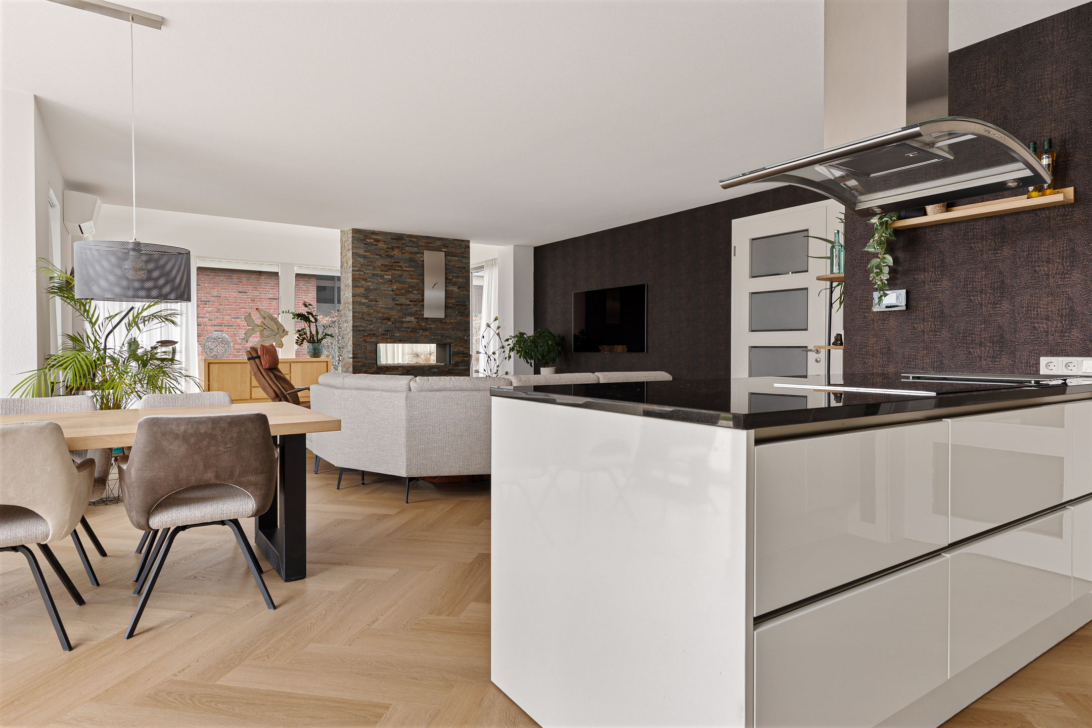 Uiteraard is bij het ontwerp en de bouw van de woning rekening gehouden met de ligging. Daarom zijn de leefruimtes aan de achterzijde gesitueerd. Hier vinden we de fraaie woonkamer met lichte erker, benoemde serre via de schuifpui en een speelse ‘roomdivider’ met gashaard. De woonkamer staat vervolgens in een open verbinding met de keuken. Hier valt direct de moderne inrichting op, compleet voorzien van alle inbouwapparatuur, een kookeiland, maar ook een tuindeur en een aangrenzende bijkeuken.