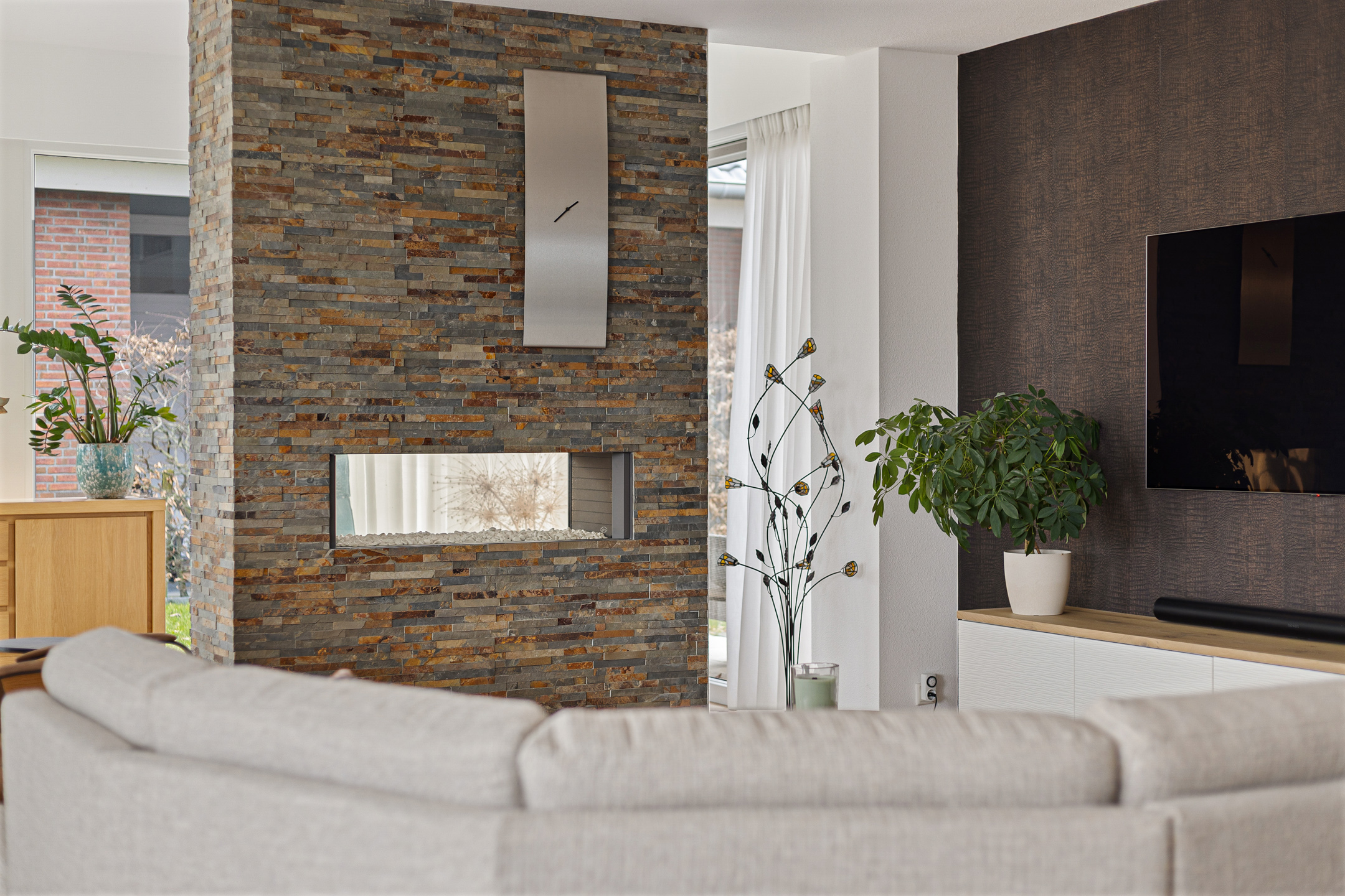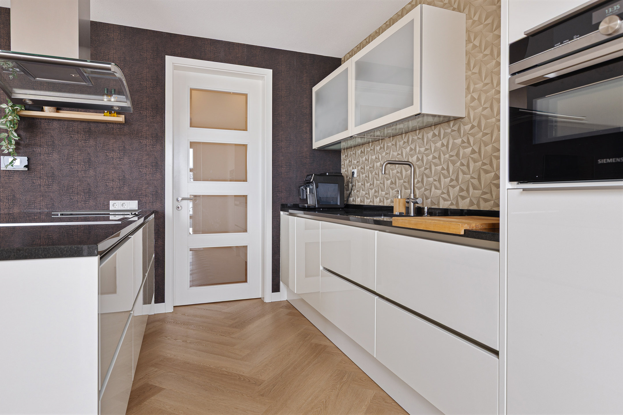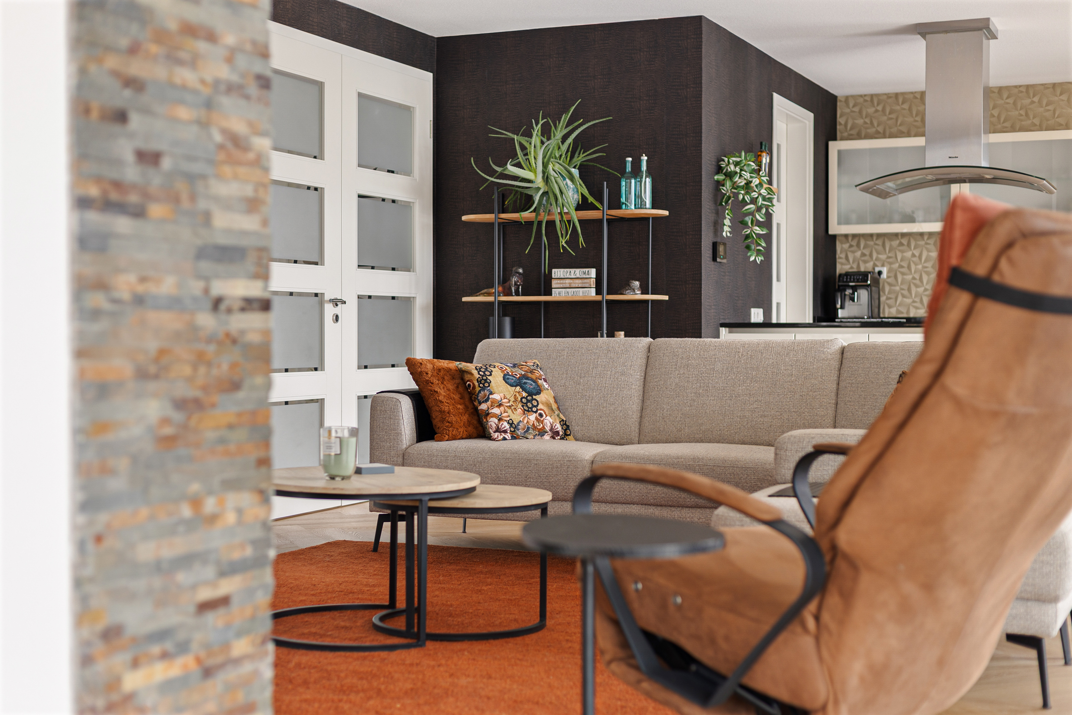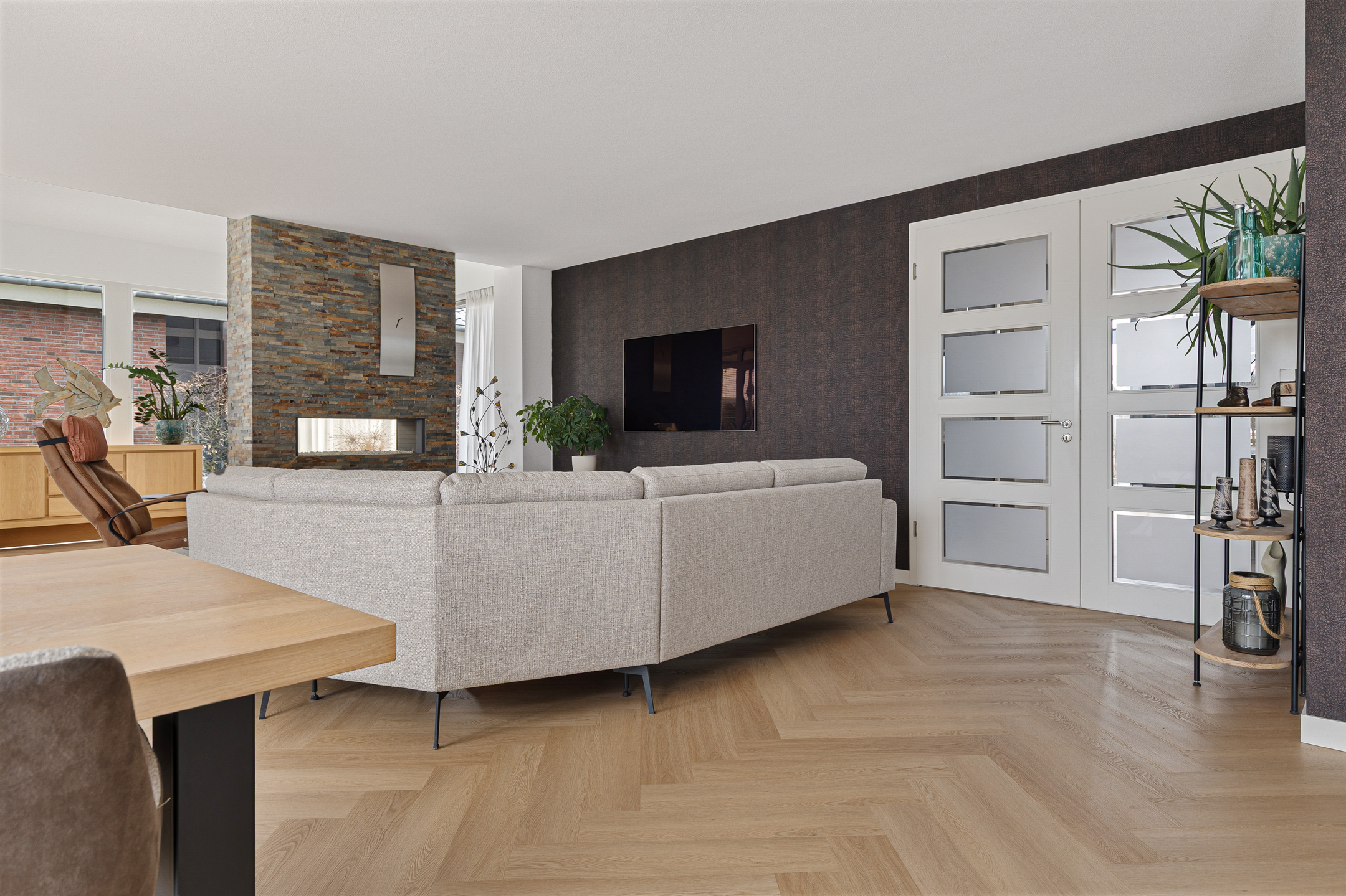 Uiteraard is bij het ontwerp en de bouw van de woning rekening gehouden met de ligging. Daarom zijn de leefruimtes aan de achterzijde gesitueerd. Hier vinden we de fraaie woonkamer met lichte erker, benoemde serre via de schuifpui en een speelse ‘roomdivider’ met gashaard. De woonkamer staat vervolgens in een open verbinding met de keuken. Hier valt direct de moderne inrichting op, compleet voorzien van alle inbouwapparatuur, een kookeiland, maar ook een tuindeur en een aangrenzende bijkeuken.