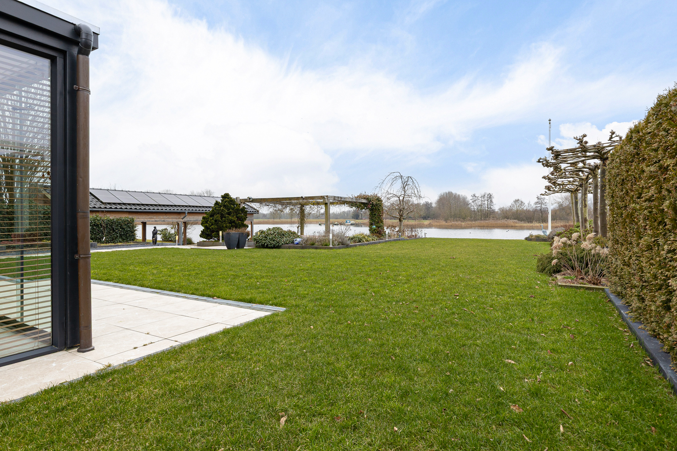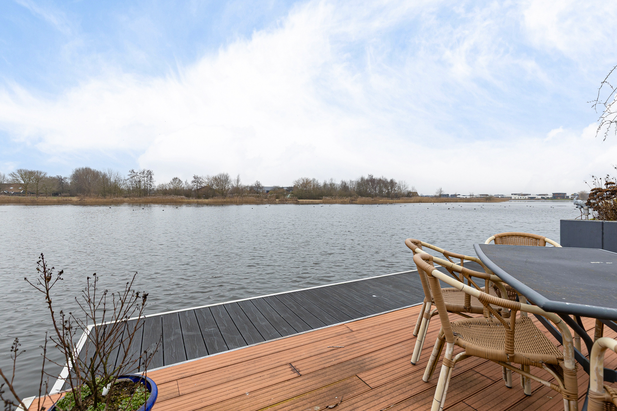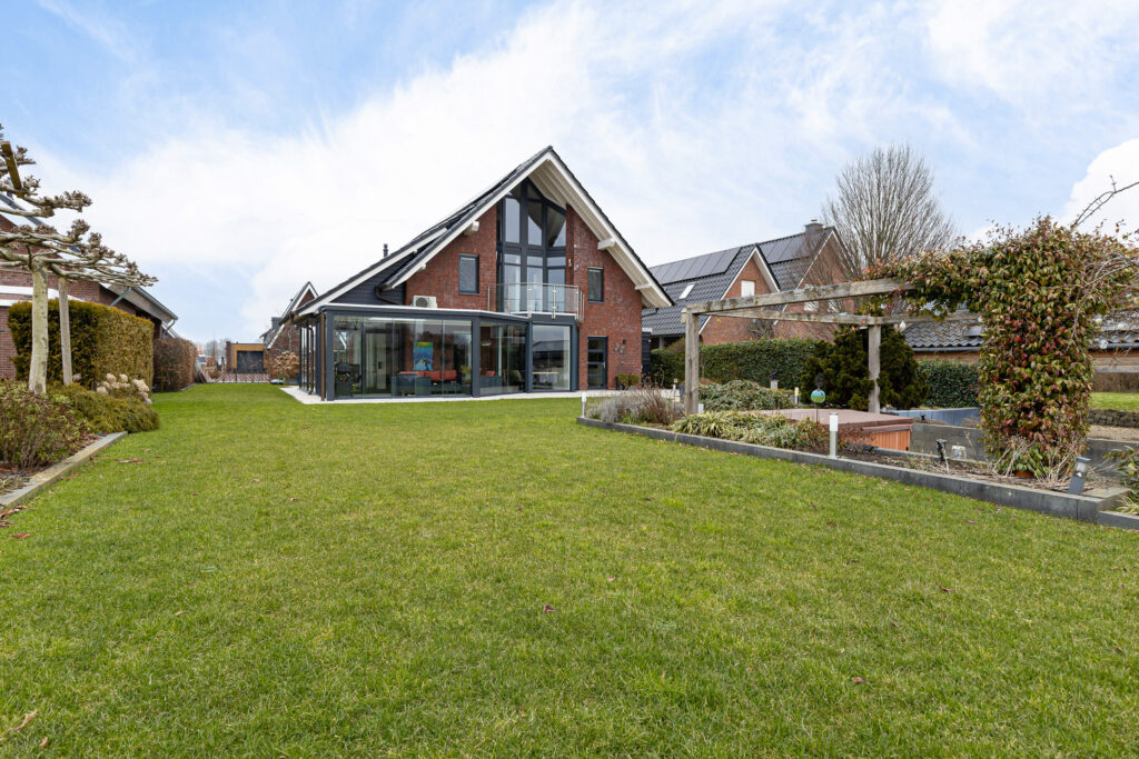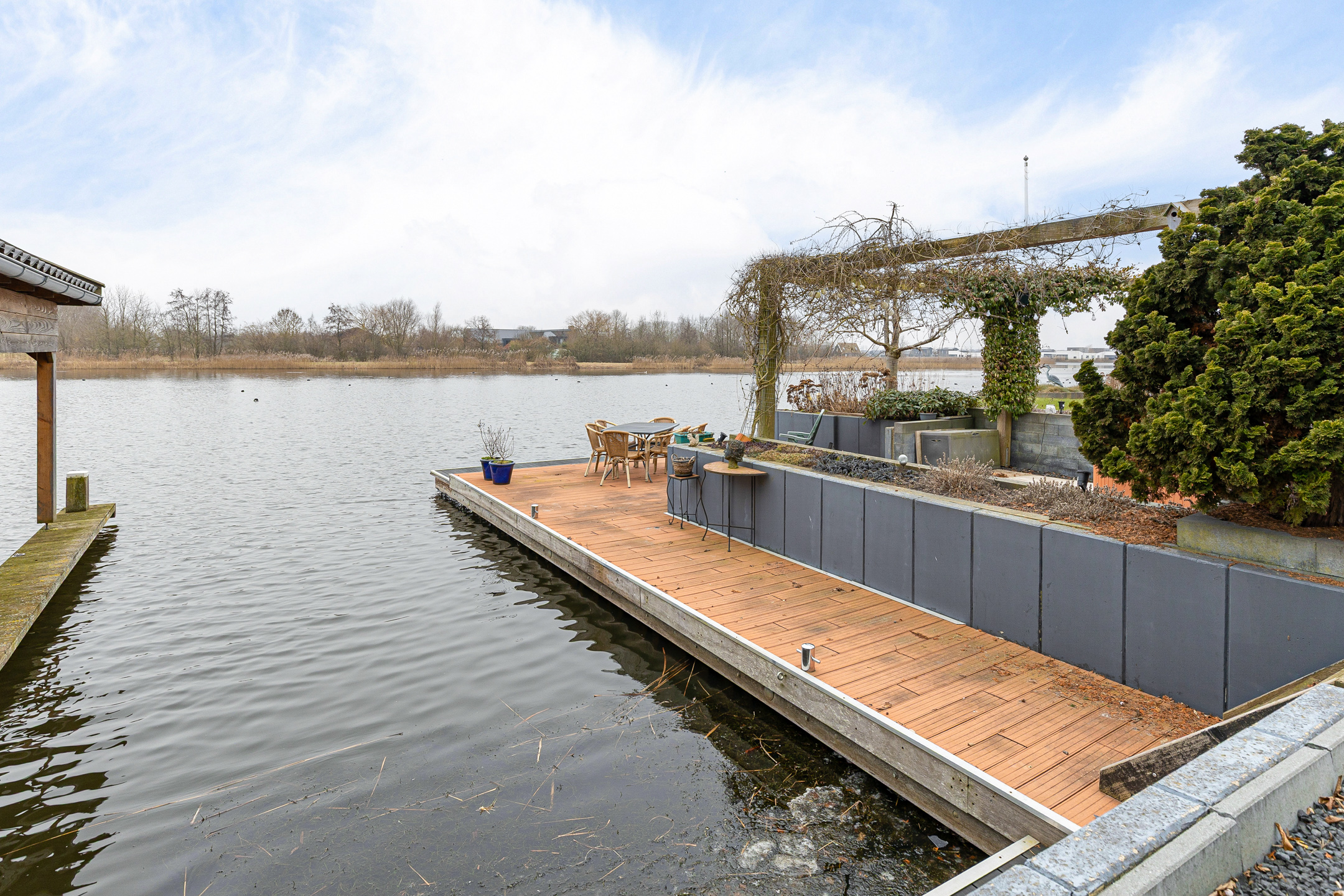 Ondanks deze functionele en esthetische voordelen vinden we de grootste bijzonderheid aan de achterzijde. Niet alleen een achtertuin op het zonnige zuiden. Door de ligging aan het einde van de straat met een vrij uitzicht zonder bebouwing ‘aan de overzijde’. Meer functioneel? Niet alleen beschikt het perceel over een steiger met terras, ook is er een eigen haventje aangelegd voor het aanmeren van uw boot of sloep. Zicht op dit ‘schouwspel’ heeft u ook vanuit de fraaie aangebouwde serre, toegankelijk vanuit de woonkamer.