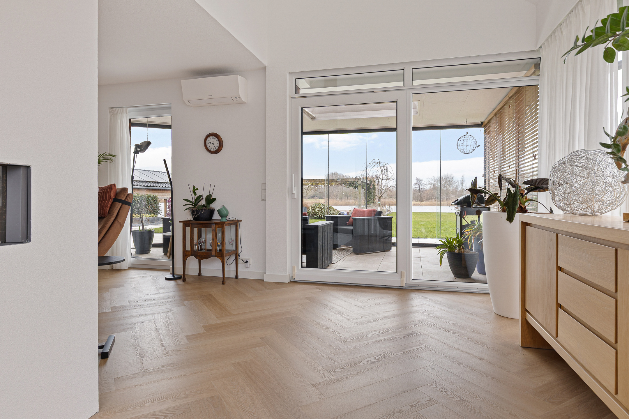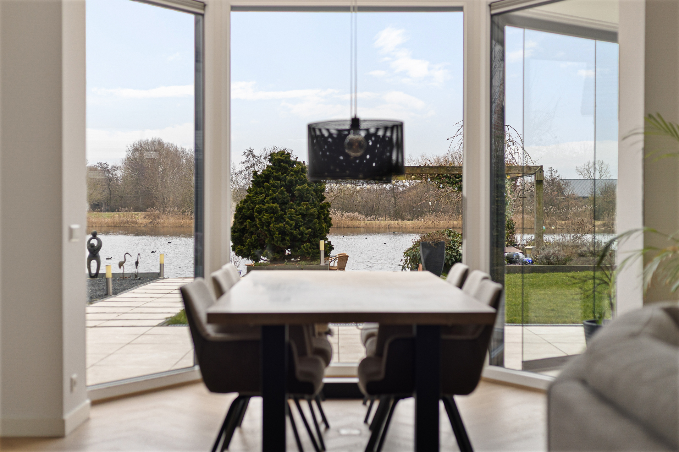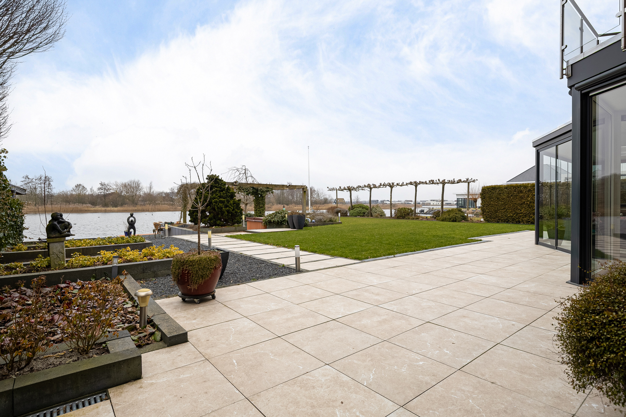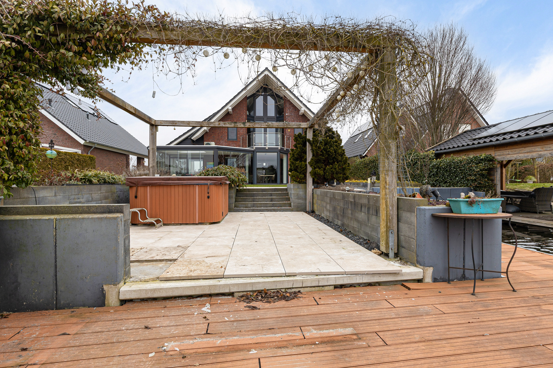 Ondanks deze functionele en esthetische voordelen vinden we de grootste bijzonderheid aan de achterzijde. Niet alleen een achtertuin op het zonnige zuiden. Door de ligging aan het einde van de straat met een vrij uitzicht zonder bebouwing ‘aan de overzijde’. Meer functioneel? Niet alleen beschikt het perceel over een steiger met terras, ook is er een eigen haventje aangelegd voor het aanmeren van uw boot of sloep. Zicht op dit ‘schouwspel’ heeft u ook vanuit de fraaie aangebouwde serre, toegankelijk vanuit de woonkamer.