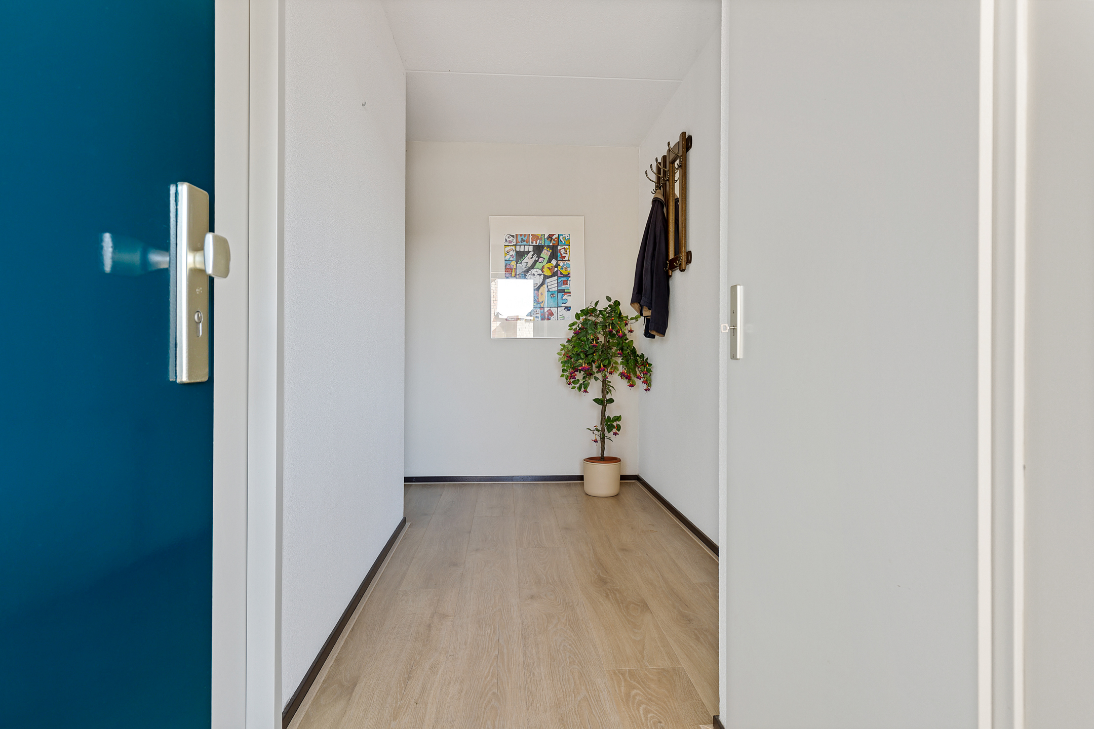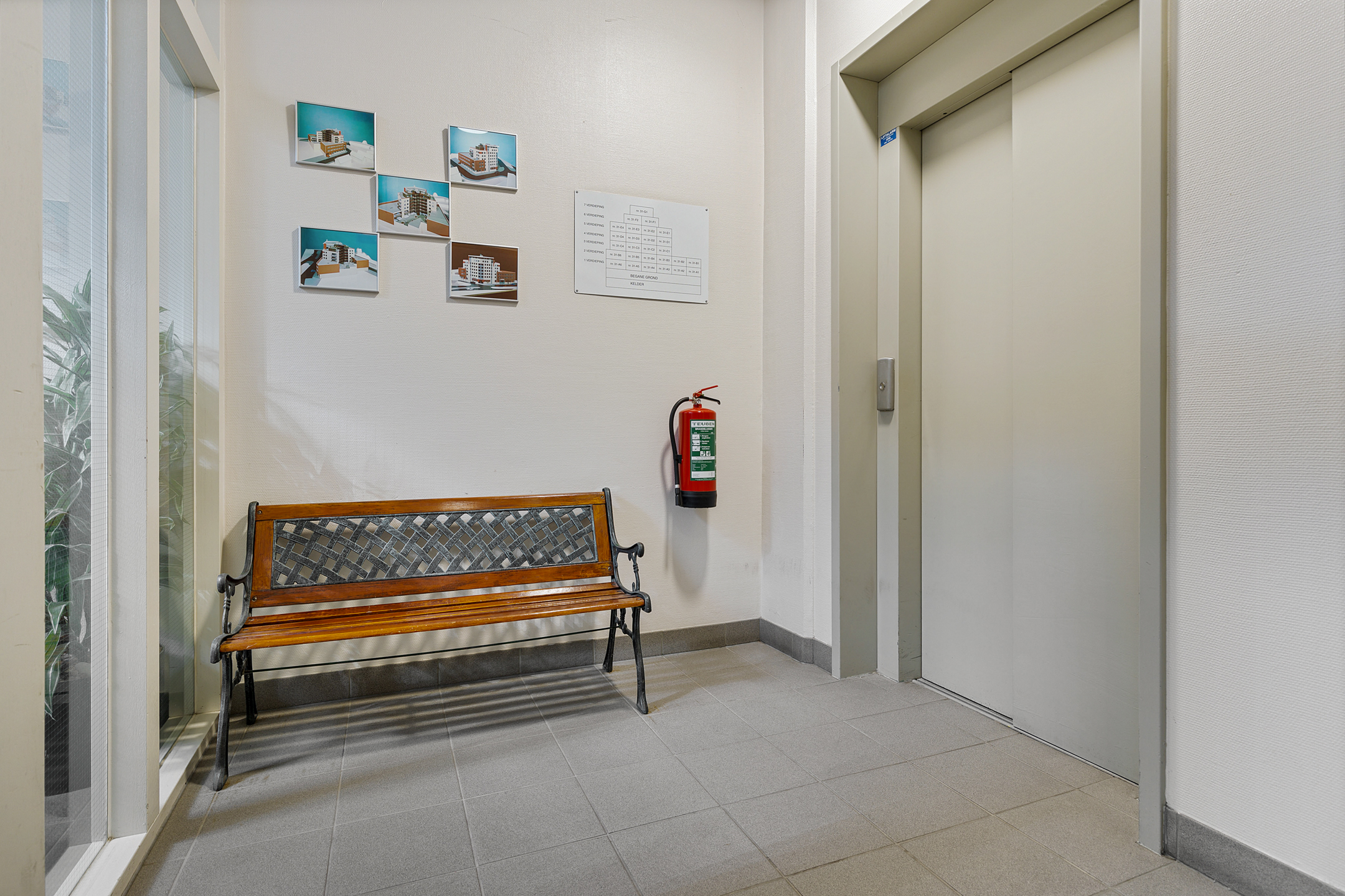 De centrale hal met trappenhuis en lift geeft toegang tot dit appartement op de eerste etage.