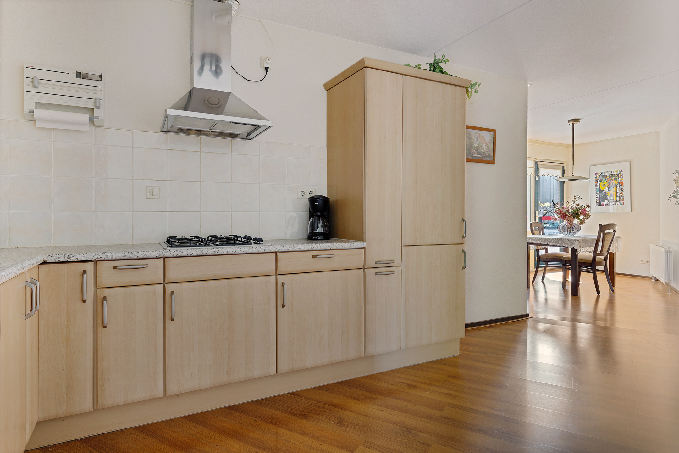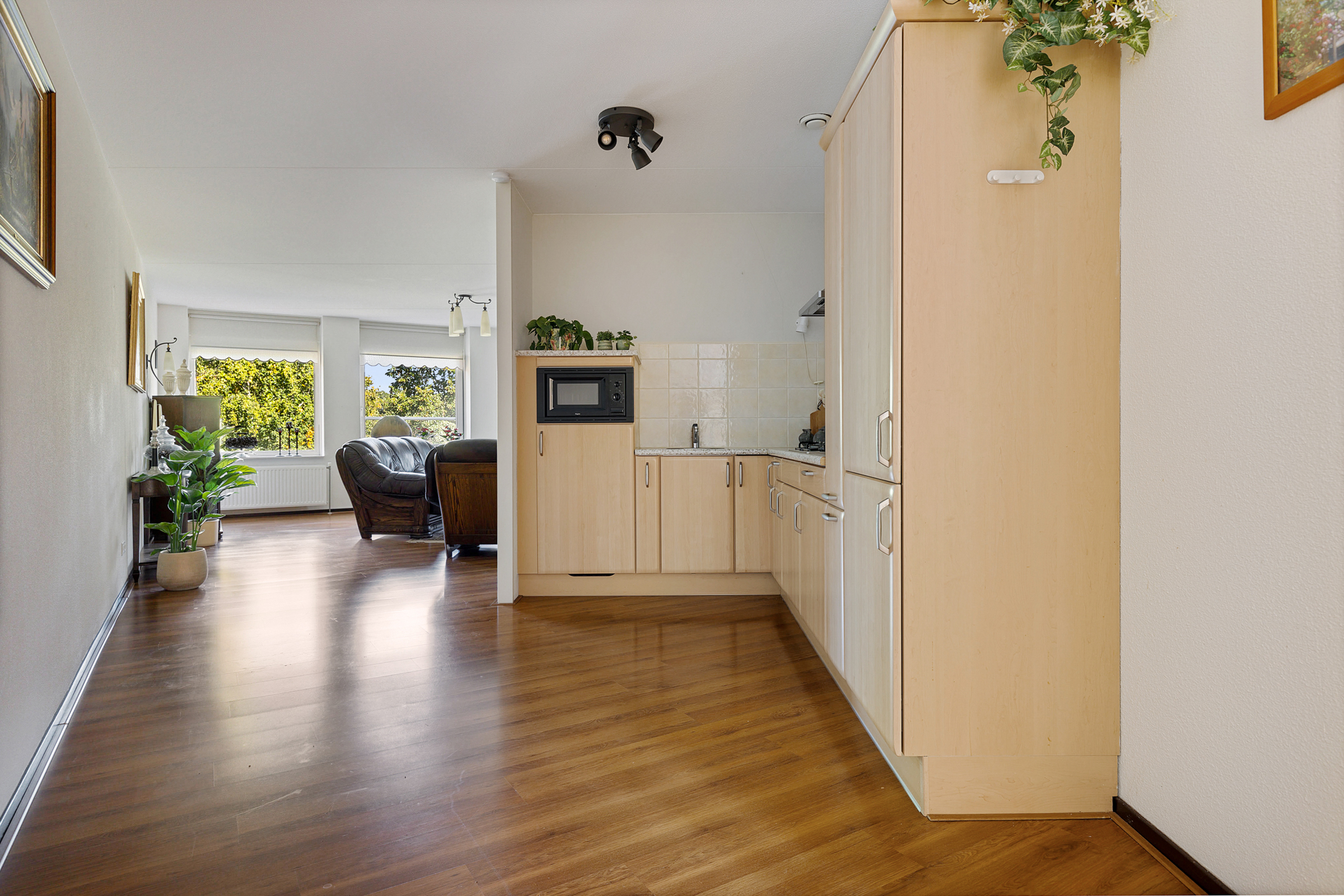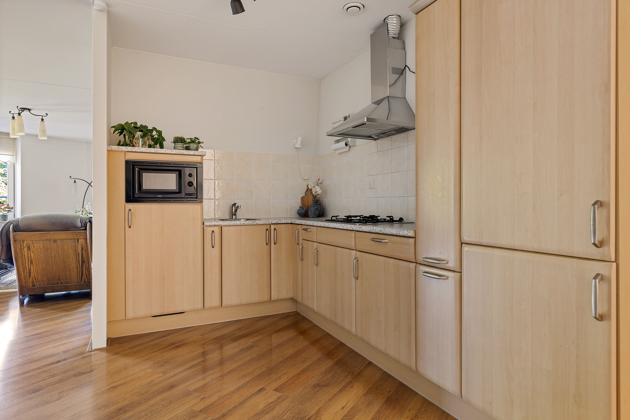 Entree/hal met meterkast en toilet. Royale en lichte woonkamer met open keuken voorzien van benodigde inbouwapparatuur en ruimte voor de eettafel.