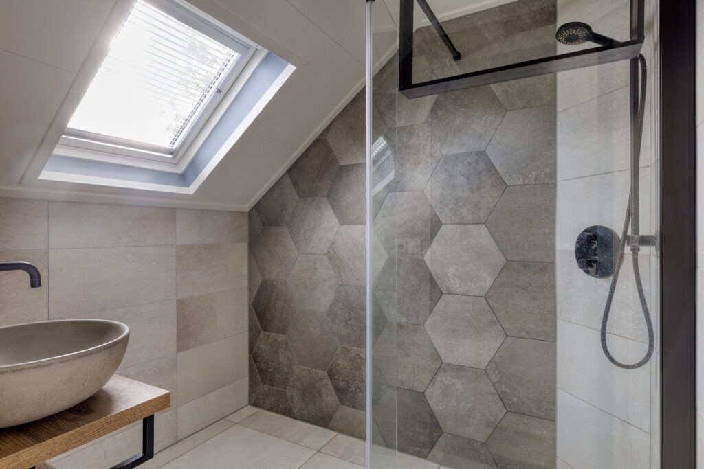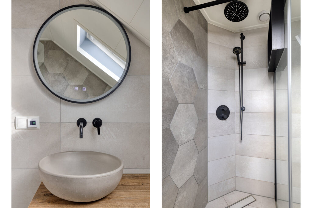 Eerste verdieping: overloop; drie slaapkamers; luxe badkamer met inloopdouche en wastafel.