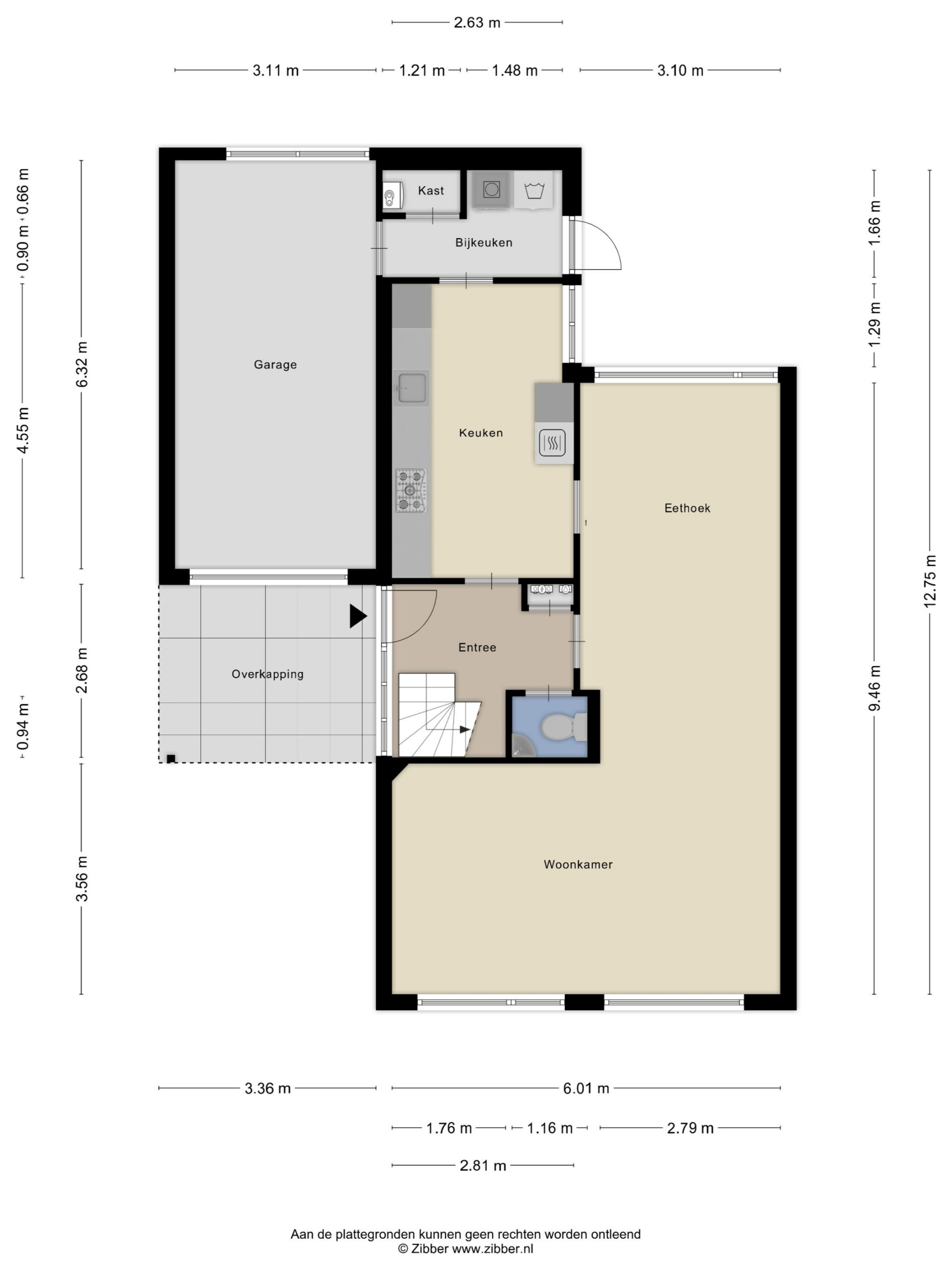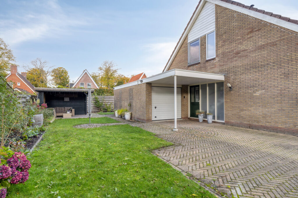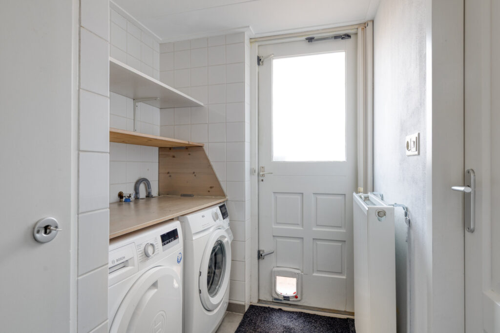 zijentree; hal met toilet en trapopgang; L-vormige woonkamer; halfopen keuken voorzien van gasfornuis, afzuigkap, vaatwasser; bijkeuken met witgoedaansluiting, cv-opstelling en achterentree; via binnendoor te bereiken garage.